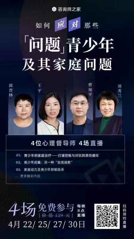 4月22、25、27、30每晚20:00有心理问题专家直播,课题《如何应对“问题”少年及其家庭问题》,请各位家长朋友们及时收看。