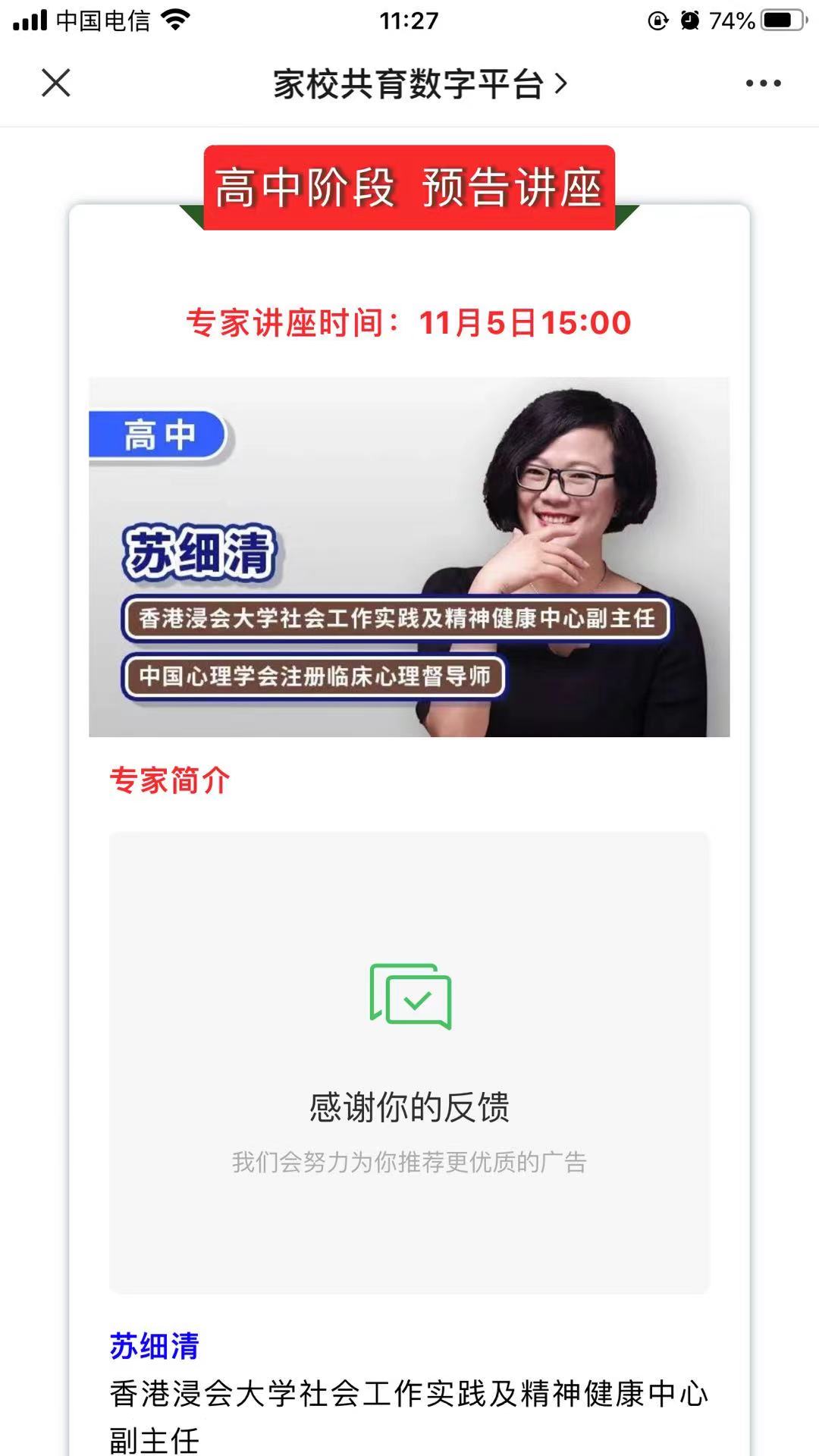★收看办法:进入“家校共育数字平台”—>专家讲座—>观看讲座—>点击进入即可观看。只有通过此途径进行专家讲座的观看,才能予以积分增加与观看率统计。