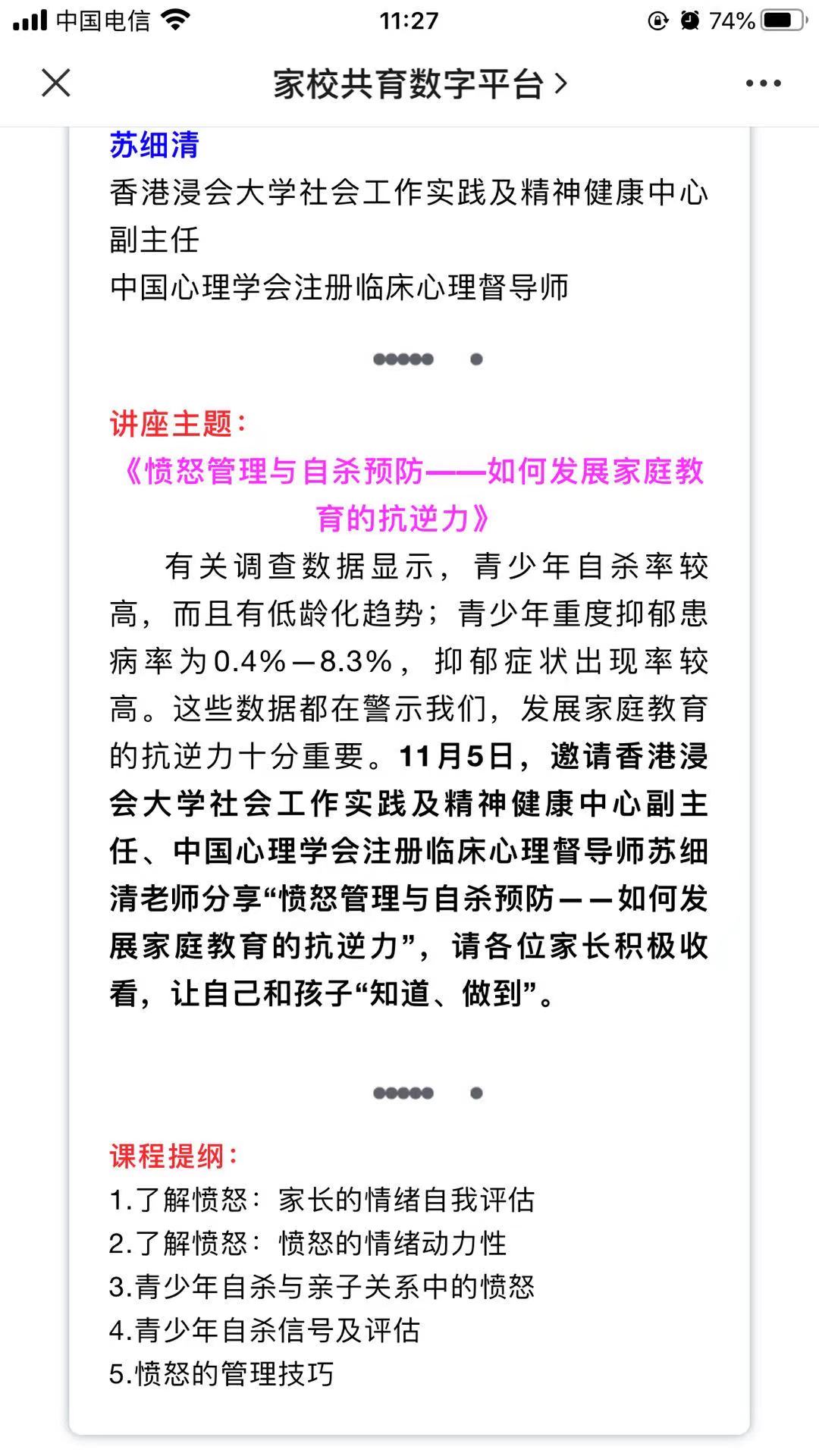 ▲讲座主题:愤怒管理与自杀预防——如何发展家庭教育的抗逆力