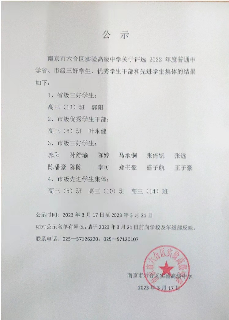 南京市六合区实验高级中学2022年度普通中学省、市级三好学生、优秀学生干部和先进学生集体拟推荐名单公示
